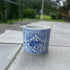 Hvit blomsterpotte med håndmalt blått chinoiserie mønster.