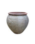 Denne karakteristiske blomsterpotten kombinerer tradisjonelt håndverk med et moderne uttrykk. Laget av brent keramikk i en subtil antikkgrønn glasur med horisontale riller som gir både tekstur og dybde. Den avrundede formen og brede åpningen gjør den ideell for større planter, urter eller dekorative oppsett. Den varme terrakottakanten rammer inn potten og gir en naturlig kontrast. Perfekt til uteplassen, inngangspartiet eller i drivhus med stil.