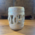 Garden Stool med håndskjærte detaljer i gul eller hvit. Merk at den gule har et hul i toppen, men den hvite har ikke det.